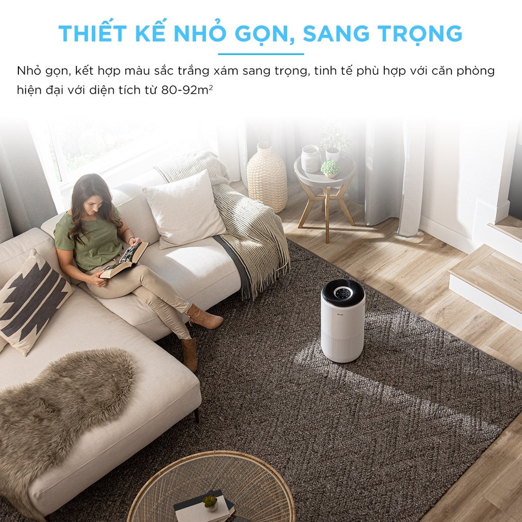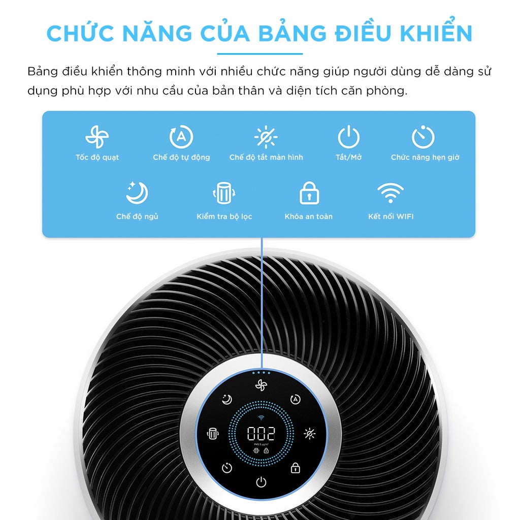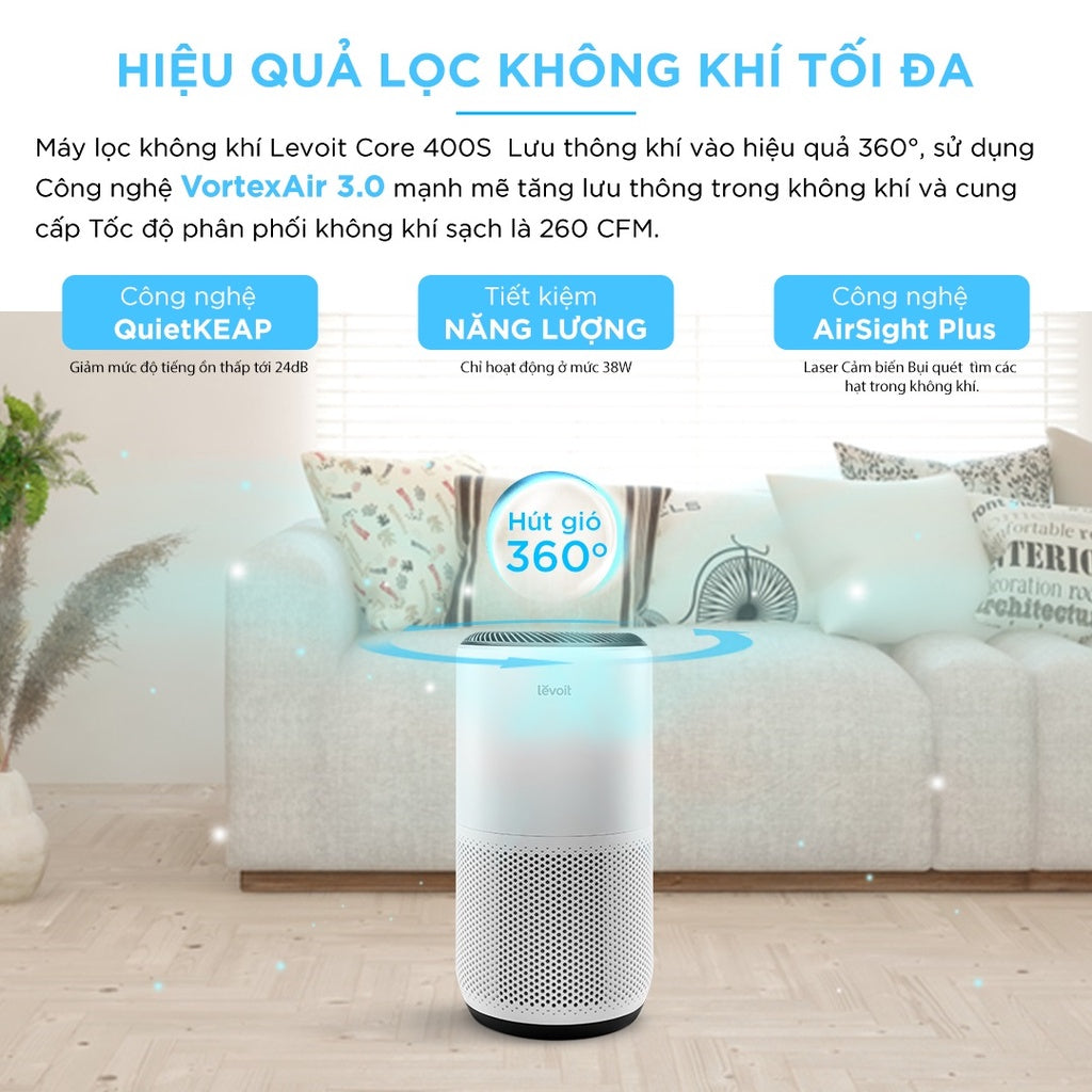 Máy Lọc Không Khí Levoit Core 400S lý tưởng cho không gian 92m², được trang bị công nghệ Air Turbo và hệ thống lốc xoáy 360 độ, giúp hút không khí từ mọi hướng và làm sạch hiệu quả nhờ bộ lọc mạnh mẽ. Thiết bị hỗ trợ điều khiển thông minh và có chức năng đo mức độ bụi trong không gian, hiển thị kết quả thông qua đèn LED.